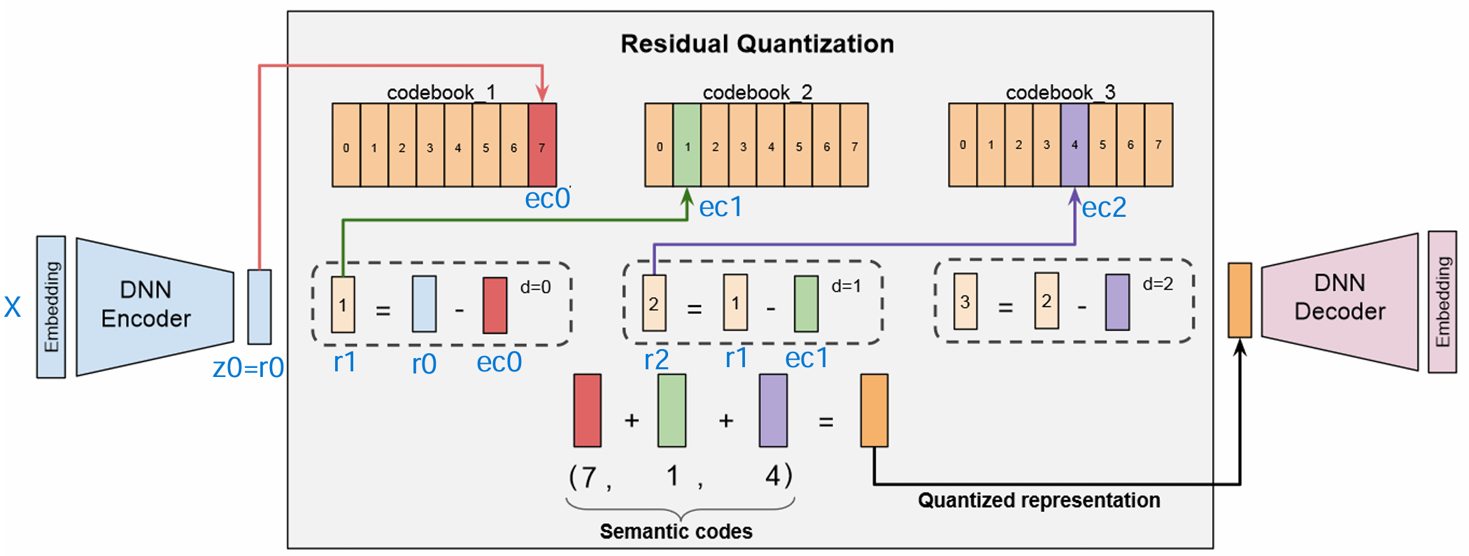 • 如此迭代,共进行 LL 级量化,得到码字索引序列 (c0,c1,...,cL1)(c_0, c_1, ..., c_{L-1})